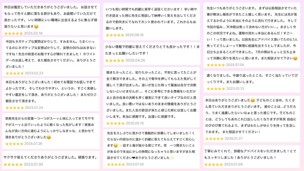 ※全国にお客様がおられることと、複雑な恋愛も多くご相談をいただくことから、コロナからオンラインのみの鑑定(公式ライン通話)のみとさせていただきましたが、的中率に変わりはありません。